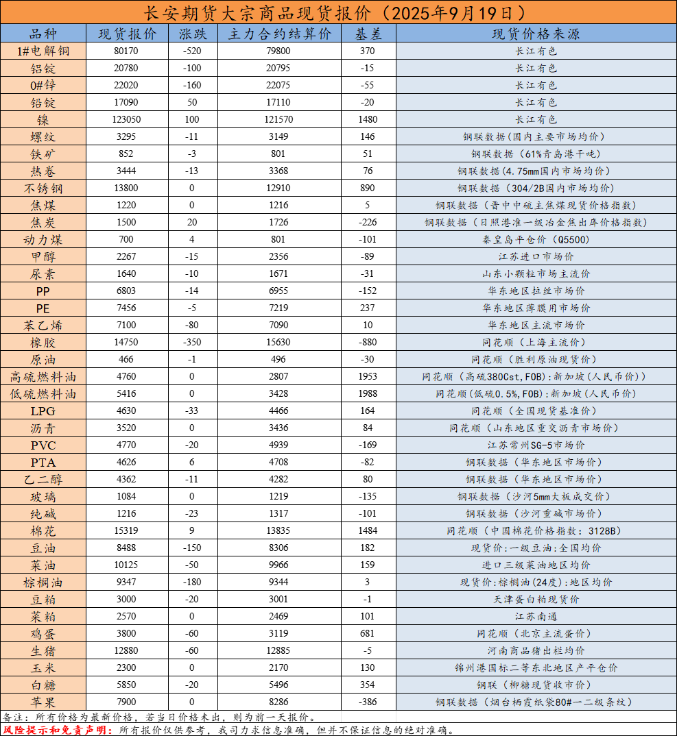 长安研究-大宗商品现货报价-2025年9月19日