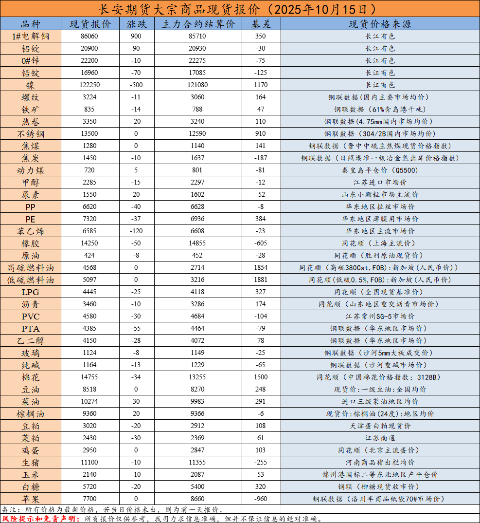 长安研究-大宗商品现货报价-2025年10月15日