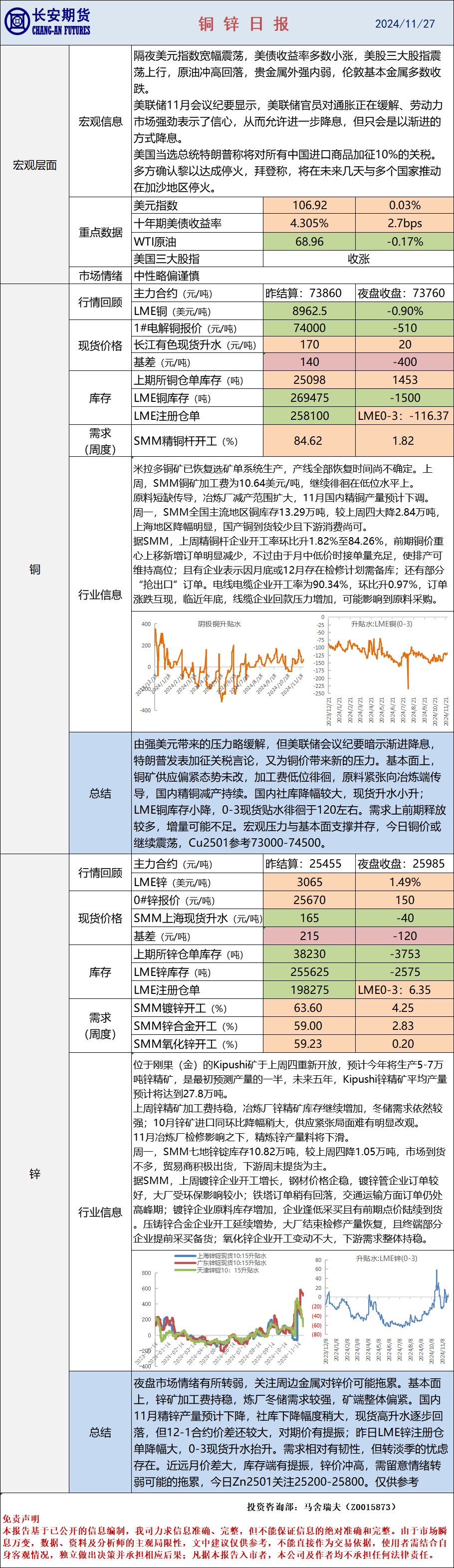 近远月价差拉大&LME锌注册仓单缩减,锌价相对偏强-铜锌早评-2024年11月27日